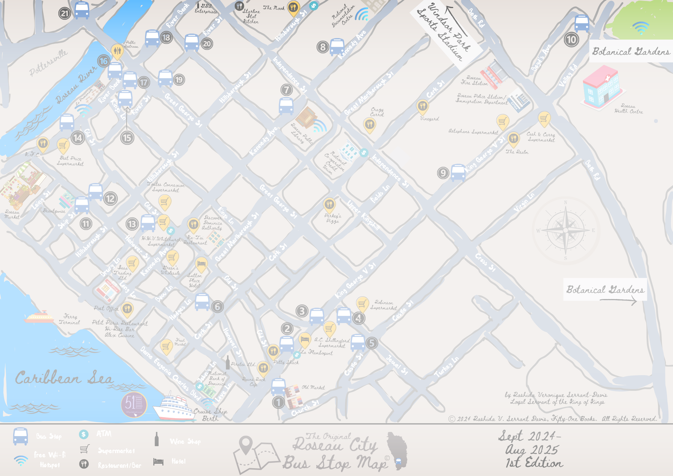 The Original Roseau City Bus Stop Map was created by Rashida V. Serrant-Davis in May 2024 to provide a street map of the capital city of the Commonwealth of Dominica that lays out all the city’s bus stops in relation to relevant landmarks and other exciting, interesting Dominica destinations island wide.
